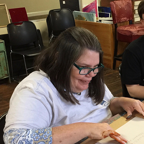 Laura has experimented with almost every medium we offer at Inside Out, and her creative imagination is unbounded. In addition to using watercolor and acrylic paint, she has used sticks, dried flowers, stamps, stencils, collage, buttons, and found objects in her creations. Laura works with intense concentration, and can often produce multiple artworks in a short amount of time.